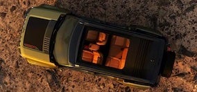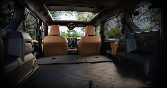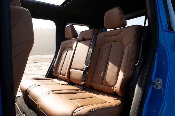 The Jeep Recon boxy body enables a spacious interior with appropriate legroom for every seat. Automatically, the interior is enhanced by the available Sky One-Touch retracting soft roof that provides convertible-like openness. The cabin prioritizes rugged utility with hard-wearing materials designed to handle dirt and outdoor adventures. Behind the second row, there's approximately 30.3 cubic feet of cargo space, expanding to 65.9 cubic feet with the rear seats folded. Additionally, there’s a small front trunk for more storage. Practical features include door bins secured with removable fabric straps that allow customization with different cargo options like small coolers, a two-tier center console, and a modular accessory rail on the dashboard for mounting action cameras and navigation devices. The interior includes clever Jeep easter eggs. Such as embossed door removal instructions and an ant driving a classic Willys Jeep etched into the rear quarter glass frit (symbolizing the vehicle's ability to crawl over anything).